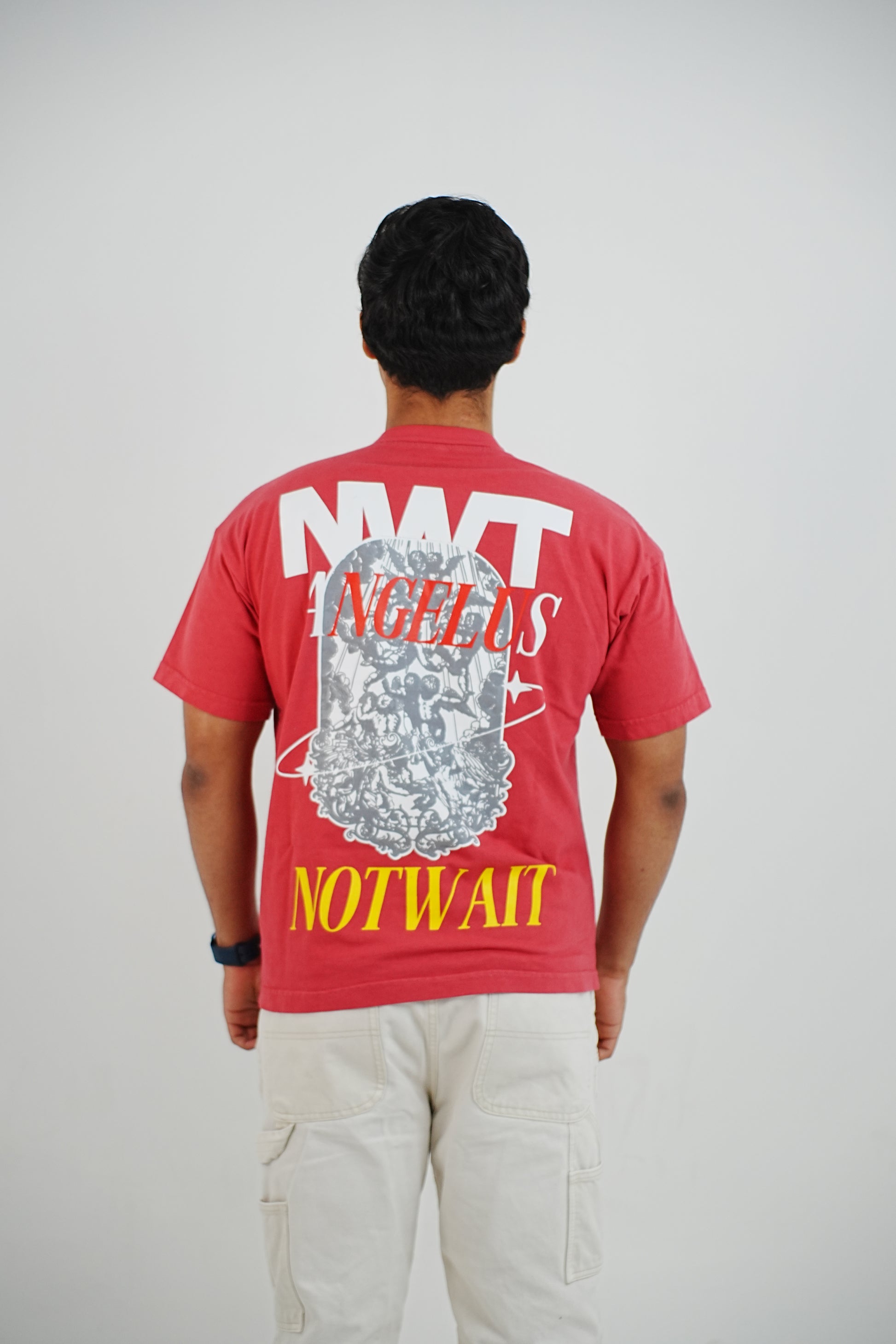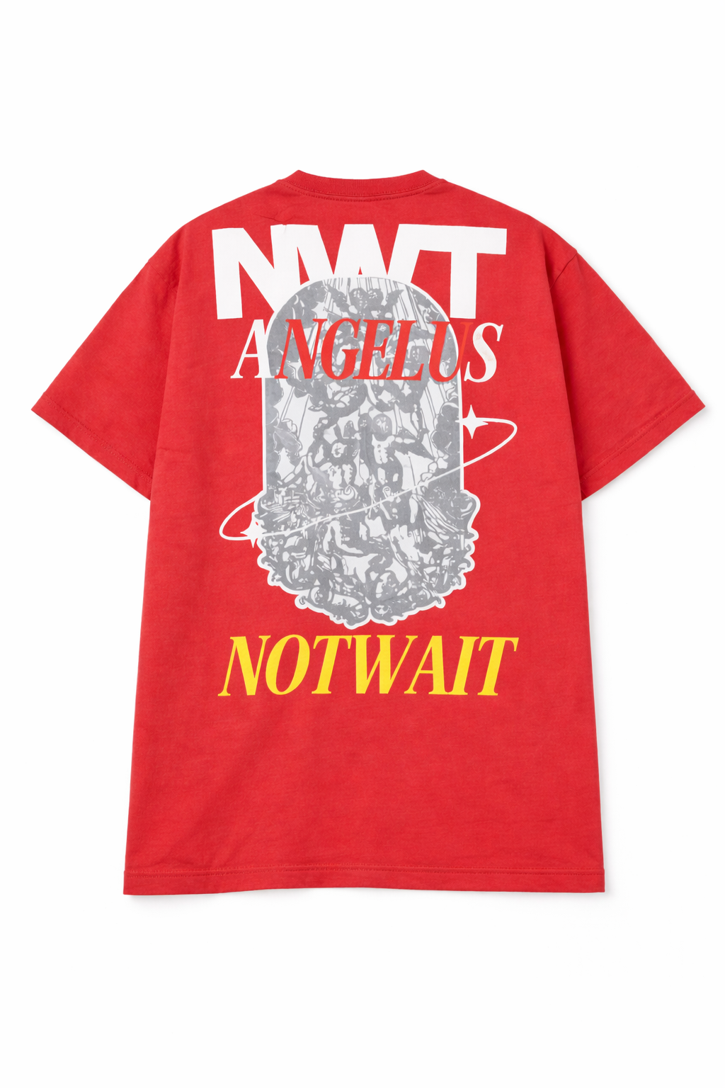 Diseño posterior inspirado en arte clásico, combinado con tipografía NOTWAIT y color rojo intenso. Fit cómodo, ideal para uso diario y looks con actitud. El modelo mide 1,72 y la talla es m